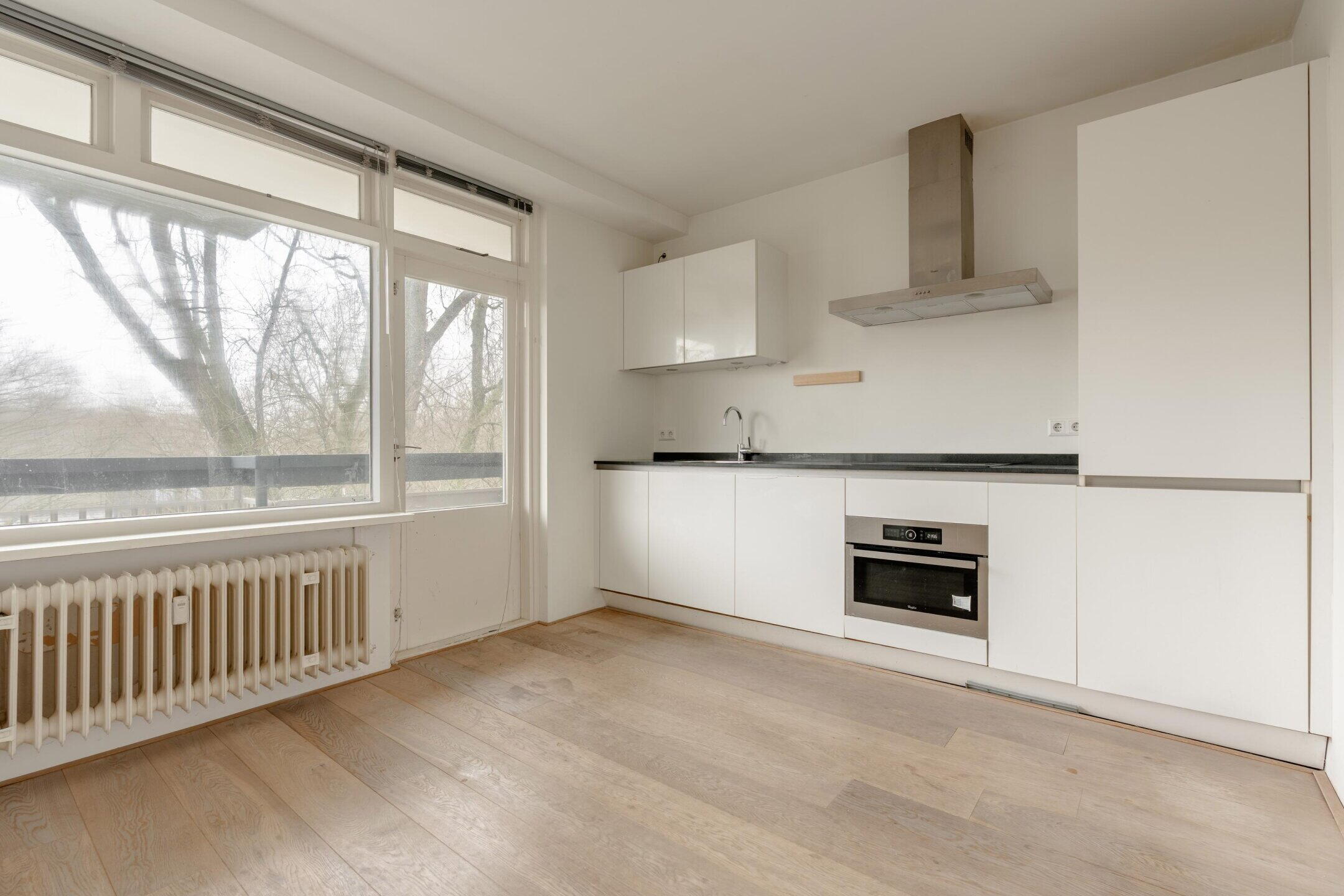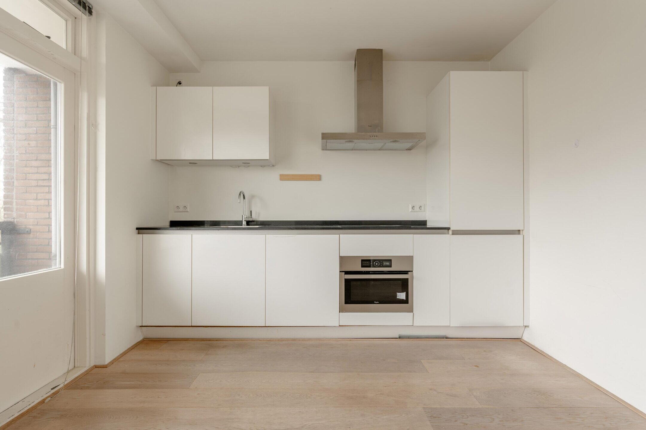 De open keuken sluit naadloos aan op de living en is modern uitgevoerd. De keuken is voorzien van diverse inbouwapparatuur, waaronder een inductiekookplaat, afzuigkap, vaatwasser, koel-vriescombinatie, spoelbak en oven. Zowel vanuit de woonkamer als via de keuken is het balkon bereikbaar.