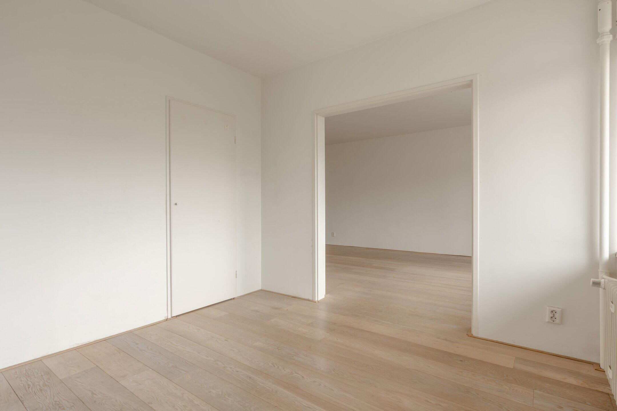 You enter the hall with meter cupboard and access to the separate toilet. From the hall, you enter the spacious living room, which enjoys pleasant light thanks to the large windows. The living room is spacious and equipped with practical built-in cupboards, so storage space is no problem at all.