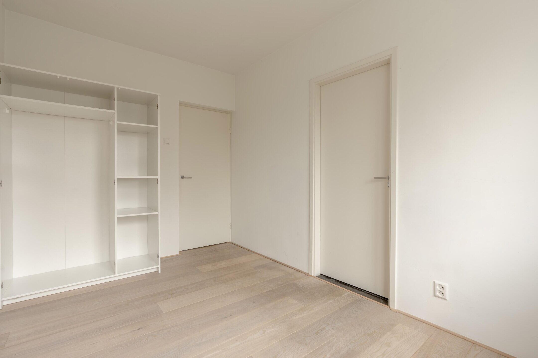 Via een tweede hal bereikt u de slaapkamer. Deze kamer is goed bemeten en beschikt over voldoende ruimte voor een tweepersoonsbed en kastruimte. Aangrenzend bevindt zich de badkamer, uitgerust met een inloopdouche met regendouche en handdouche, wastafelmeubel en aansluitingen voor wasmachine en droger.